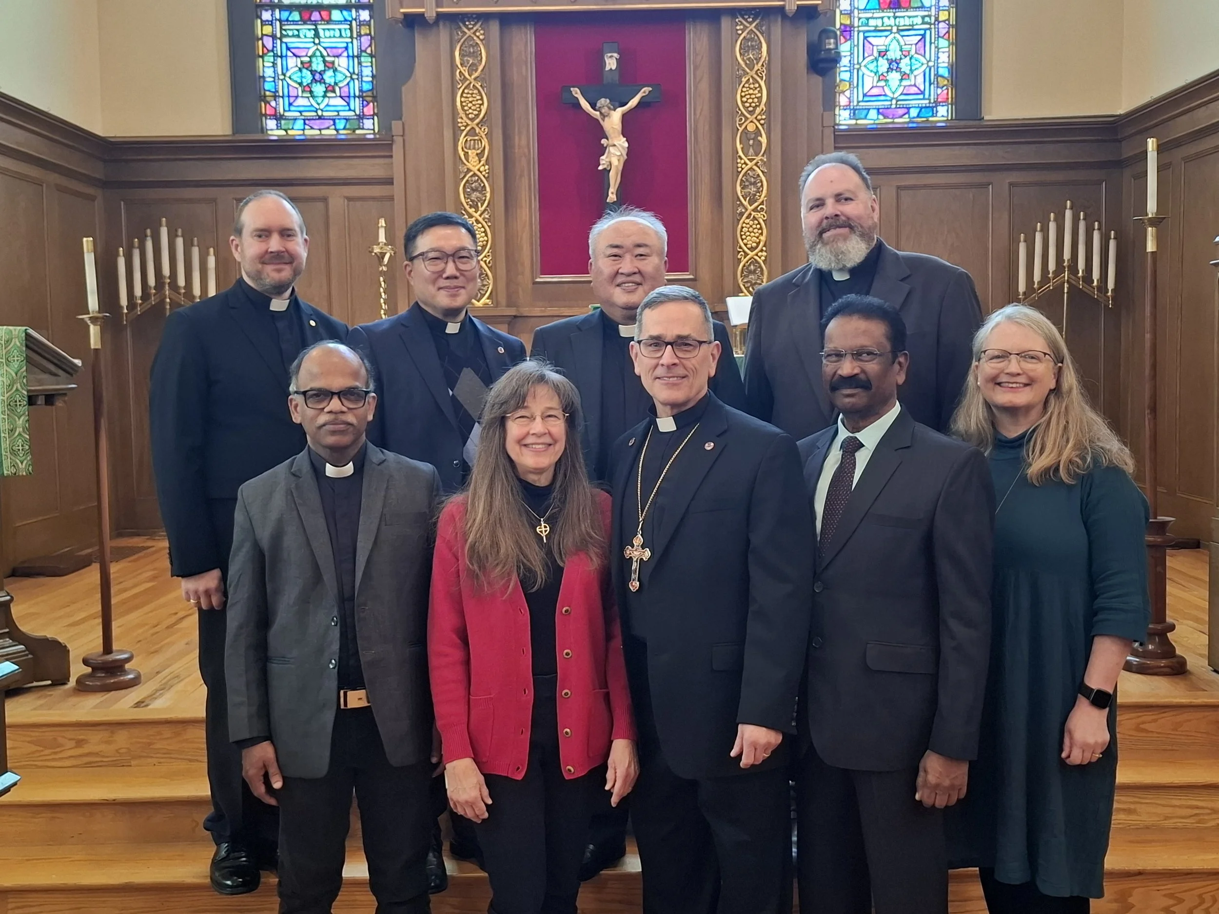 Three international delegations were welcomed at Redeemer Lutheran Church Fort Wayne. Back row (L to R): Rev. Michael Prenzler, Rev. Dr. Jun-Hyun Kim, Interim President of Luther Theological University in South Korea, Rev. Dr. Won Jong Ho, President of LCK, Pastor Matt Anker. Front row (L to R): Rev. Dr. P.R. Selvaraj, Principal of Concordia Theological Seminary Nagercoil, Mrs Brenda Shaw and Rev. Dr. Jonathan Shaw, Mr Ravi Jesupatham, LCMS country coordinator for the India Evangelical Lutheran Church, and Mrs Libby Krahling.